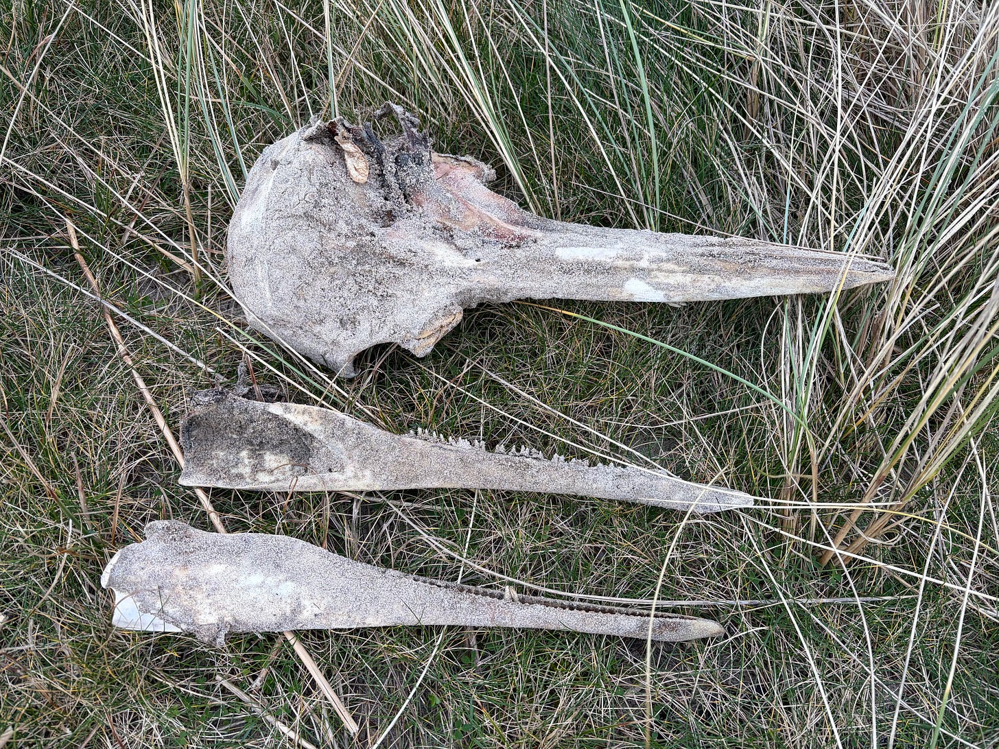 I am desperately proud of a porpoise skull I pulled out of the Solway ten years ago – but this head was twice the size and it also had the accompanying jaws in place. I was ready to endure the terrible smell of that dolphin on the long drive home for the sake of comparing and contrasting the two skulls, but even as I started to work out how I would wrap it up and carry it back to the car, the serried ranks of tiny, delicate teeth began to fall out of their sockets and down into the sand. There were just too many of them, and as they tumbled out of the skull, I immediately lost track of which one had been where. Bottlenose dolphins have around 100 teeth, and even the ones I could find again were desperately fiddly little things with hollow roots. In no time at all, the skull was looking decidedly gummy – and the appeal of this monstrous head was further reduced by a thin stream of shockingly rancid gel which had begun to trickle out of the hole where the spinal column used to be.
