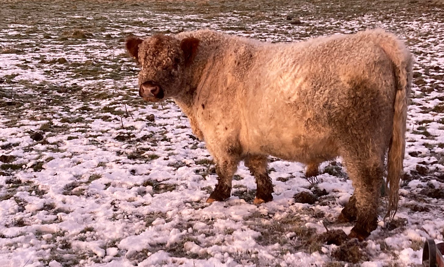 That recent move towards Bluegrey cattle has revealed a downside. After ten years breeding Galloways, the change in direction called for a new bull which has been much discussed on this blog. “Oswald” the Whitebred Shorthorn arrived from Alnwick and set the herd to rights – and to be clear, I have no backward glance in this direction. He’s the proper man for the job, and I can’t wait to see his calves. But it has left me with a spare part – the much vaunted (but suddenly defunct) white Galloway bull who has been working well these last four years. I can certainly justify the cost and upkeep of a single bull, but the idea of keeping two is crazy – not least for the sake of easy management and the hope of a peaceful life.